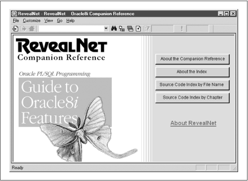 The content of the companion Windows disk that accompanies this book has been included on this CD, in the /guide8i/disk/ directory. It contains the Companion Reference, an online tool designed by RevealNet, Inc. to help you find additional resources. The guide offers point-and-click access to approximately 100 files of source code I've prepared to accompany this book, as well as a copy of the PLVtmr package (described in the Preface). The goal of providing this material in electronic form is to give you a leg up on the development of your own PL/SQL programs for Oracle8 i .