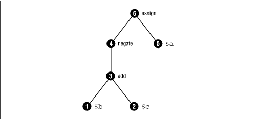 Each opcode is the smallest unit of executable instruction that Perl can think about. You might see an expression like $a = -($b + $c) as one statement, but Perl thinks of it as six separate opcodes. Laid out in a simplified format, the parse tree for that expression would look like Figure 18-2. The numbers represent the visitation order that the Perl run-time system will eventually follow.